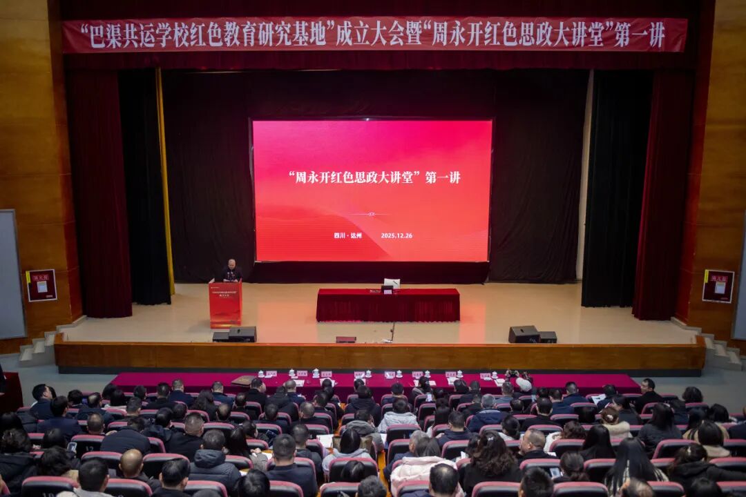 2025年12月26日上午,在纪念毛泽东同志诞辰132周年之际,太阳成集团tyc234cc古天乐艺术传媒大楼多功能厅庄重而热烈,“巴渠共运学校红色教育研究基地”成立大会暨“周永开红色思政大讲堂”第一讲在此隆重举行。本次活动由达州市委教育工委与太阳成集团tyc234cc古天乐联合主办,标志着川东北地区红色教育研究与实践迈向体系化、协同化、品牌化的新阶段。市级相关部门,巴中市、广安市委教育工委,原“巴渠共运友好学校联谊会”成员单位,大中小学思政课一体化共同体代表及师生代表等齐聚一堂,共襄红色教育盛举。