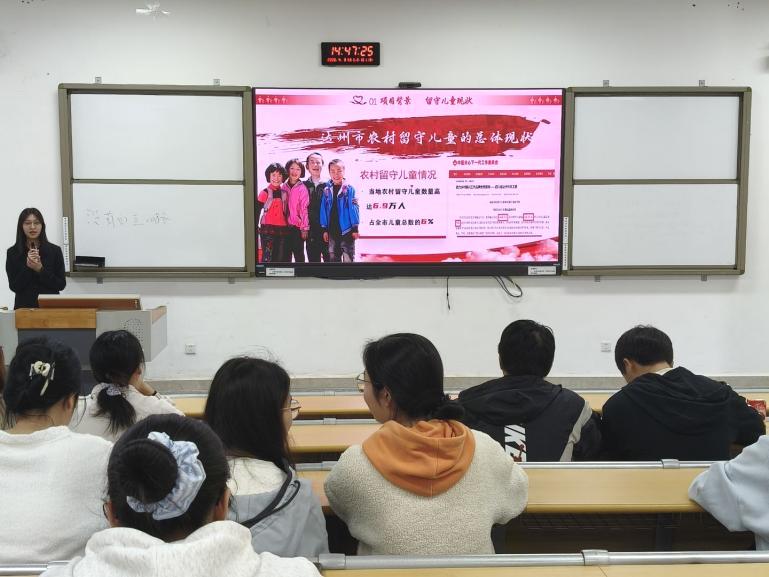 在项目分享环节,两个国家级项目团队成员依次上台,结合自身实践经历,分享项目从立项到落地的完整历程,让在场学生直观感受科研实践的艰辛与价值。团队成员何美林围绕“川东革命老区农村留守儿童陪伴服务模式创新”项目,从背景、立项、开展、成果等方面进行汇报。团队立足达州6.9万留守儿童现实困境,以“学业+心理+红色教育”为核心,通过千份问卷调研与多乡镇线下服务,实现留守儿童学业水平、心理健康及红色文化认知三方面显著提升,项目获地方媒体报道与多项荣誉。刘湘则分享了农村中学性教育项目的历程,虽在基层落地中遇到困难,但积累了一线实践经验,研究成果正在筹备向学报投稿。曹红梅对两个团队成果给予充分肯定,强调科研需聚焦主题深耕细作。