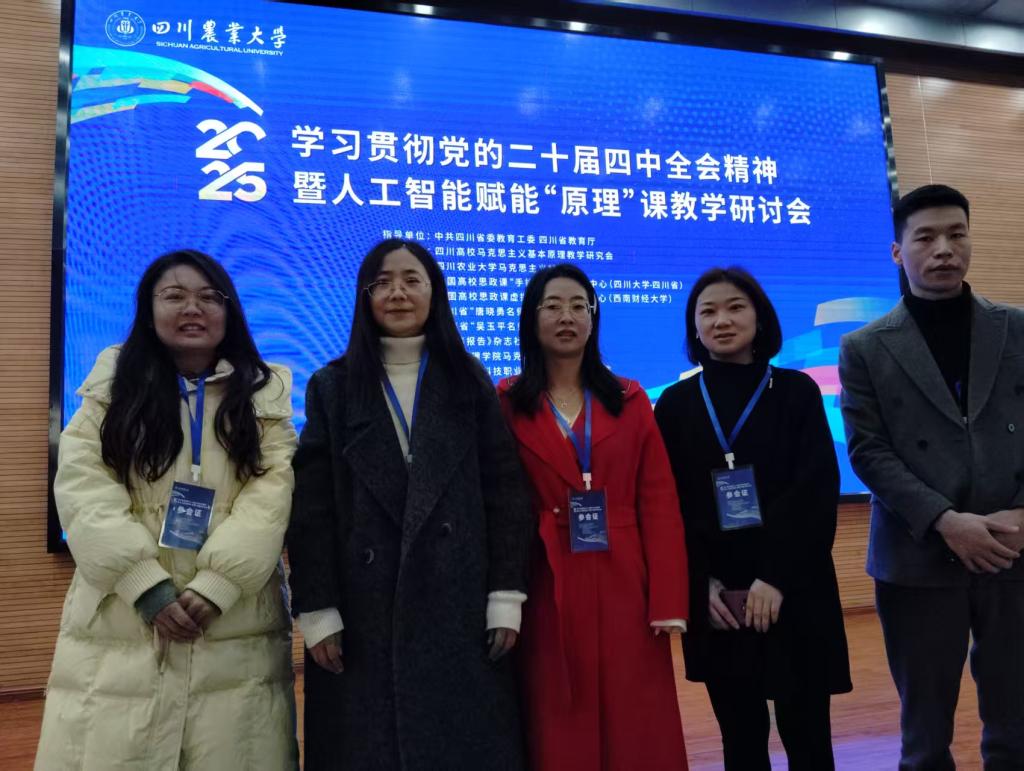 11月29日,以“学习贯彻党的二十届四中全会精神暨人工智能赋能‘原理’课教学”为主题的四川高校马克思主义基本原理教学研究会2025年年会,在四川农业大学温江校区成功召开。我院马克思主义基本原理教研室文茂群、杨建霞、蒲小梅、李兆东、杨康莉五位教师应邀参会。