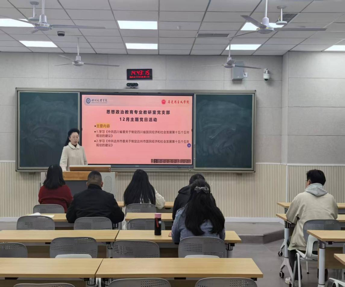 本次活动紧密结合教研室近期工作,围绕党建学习与专业建设展开,与会教师集中学习了《中共四川省委关于制定四川省国民经济和社会发展第十五个五年规划的建议》以及《中共达州市委关于制定达州市国民经济和社会发展第十五个五年规划的建议》,通过学习,教研室成员进一步提升了对国家与地方发展战略的认识,明确了将党的方针政策有效融入思政课教学与专业建设的方向。