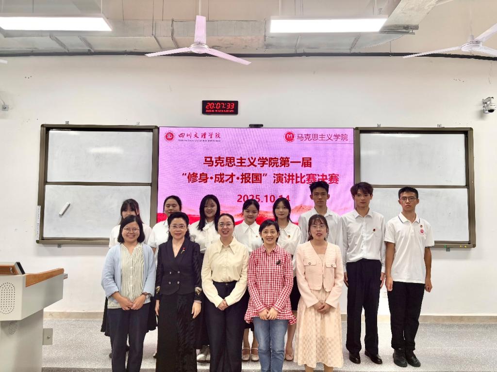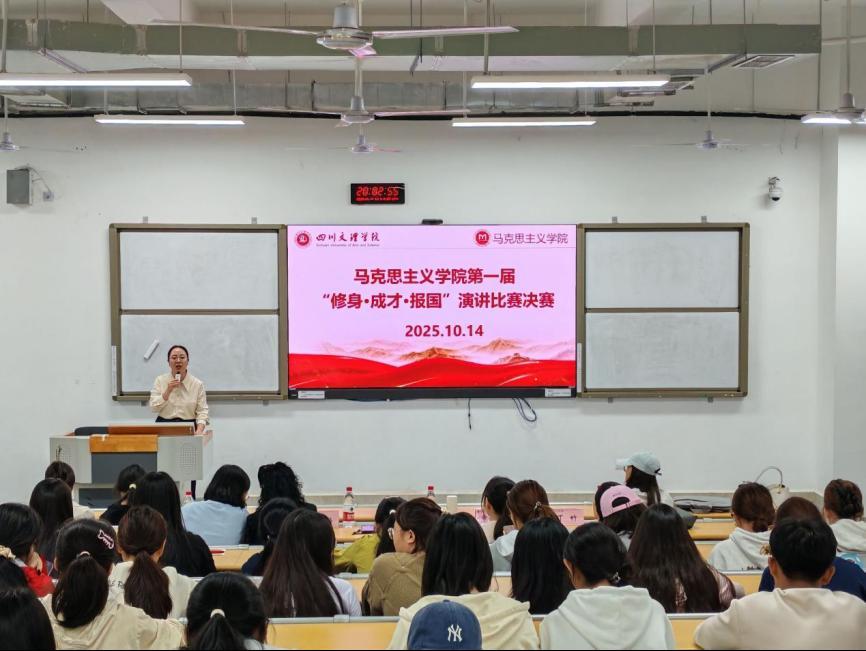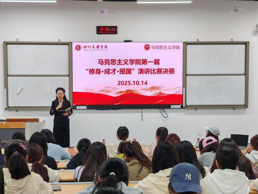 为弘扬修身立德之风,激发学子成才之志,厚植报国情怀,马克思主义学院于2025年10月14日19:00在东区教室A318举办首届“修身·成才·报国”演讲比赛决赛。学院党委副书记周春滟、正处级组织员丁竹、思想政治教育教研室主任曹红梅、专任教师张岚、专职辅导员覃秋霞出席比赛并担任评委,全体大一新生到场聆听比赛。